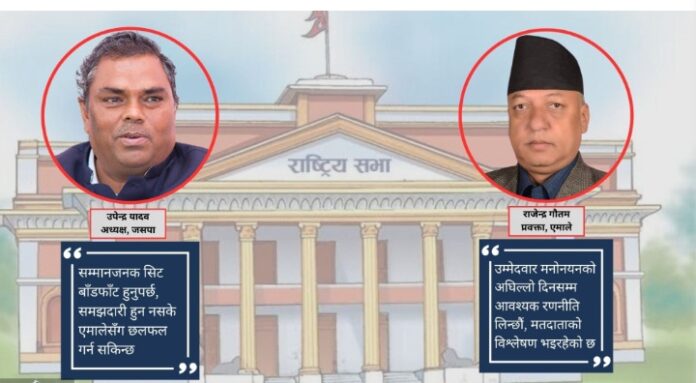 जसपा अध्यक्ष उपेन्द्र यादवले राष्ट्रिय सभा निर्वाचनमा पहिलो तालमेलको सम्भावना सत्ता गठबन्धनसँग भएको बताए । गठबन्धन दलमा बैठक भएपछि राष्ट्रिय सभा निर्वाचनमा तालमेल स्पष्ट हुने उनको भनाइ छ । ‘पहिलो प्राथमिकता गठबन्धनमै रहेर उम्मेदवार दिने हुन्छ,’ उनले भने, ‘सम्मानजनक सिट बाँडफाँट हुनुपर्छ भन्ने मान्यता हो ।’ उनले गठबन्धनमा सिट बाँडफाँटमा समझदारी हुन नसके एमालेसँग छलफल गर्न सकिने बताए । ‘दलहरूबीच छलफल जहिले पनि खुला हुन्छ,’ उनले भने । जसपाबाट प्रमिला कुमारी ९मधेश० पदावधि सकिँदै छ । जसपाले १९ मध्ये दुई सिट दाबी गरेको एक नेताले बताए । उसले मधेश र लुम्बिनी प्रदेशबाट दुई सिट दिनुपर्ने बताएको छ ।