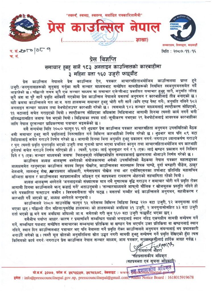 काठमाण्डौ – प्रेस काउन्सिल नेपालले समाचार हुबहु सार्ने एक सय ८३ वटा अनलाइनलाई कारबाही गरेको छ । काउन्सिलले पछिल्लो डेढ वर्षमा एक सय ८३ वटा अनलाइनलाई समाचार चोरीअन्तर्गत कारबाही गरेको हाे । काउन्सिलले विज्ञप्ति जारी गरी समाचार हुबहु चोरी गरी सार्ने (कपी एण्ड पेस्ट गर्ने), अनुमति नलिने एक सय ८३ वटा अनलाइन सञ्चारमाध्यम तथा वेबपोर्टललाई कारबाही गरेको जनाएको हो ।