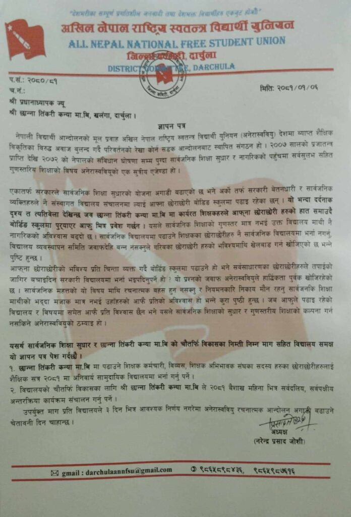 एमाले निकट अखिल नेपाल राष्ट्रिय स्वतन्त्र विद्यार्थी युनियन दार्चुलाले विद्यालयमा कार्यरत कर्मचारी, शिक्षक, विद्यालय व्यवस्थापन समिति र अभिभावक संघका सदस्यहरुले आफ्ना छोराछोरी सोही विद्यालयमा भर्ना गर्न माग गरेको छ । अनेरास्ववियुले बिहीबार सदरमुकाम खलंगास्थित महेन्द्र नमूना मावि खलंगा र छन्नातिंकरी कन्या माविलाई ज्ञापन पत्र बुझाउँदै यस्तो माग गरेको हो ।