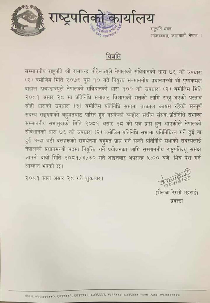 उनले असार ३० गते आइतबार बेलुका ५ बजेसम्म प्रधानमन्त्रीको दाबी गर्न दुई वा दुई भन्दा बढी दलको समर्थनमा बहुमत प्राप्त गर्नसक्ने प्रतिनिधि सभा सदस्यलाई प्रधानमन्त्रीको दाबी पेस गर्न भनेका हुन् । यसअघि उनले कानुनविद्हरूसँग राय लिएका थिए ।
