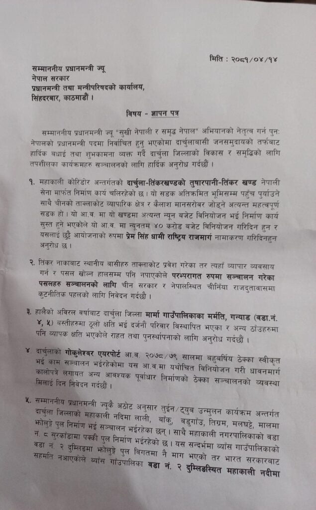 यस्तो छ, प्रधानमन्त्री ओलीलाई दार्चुलाबासीको आठ बुदे माग