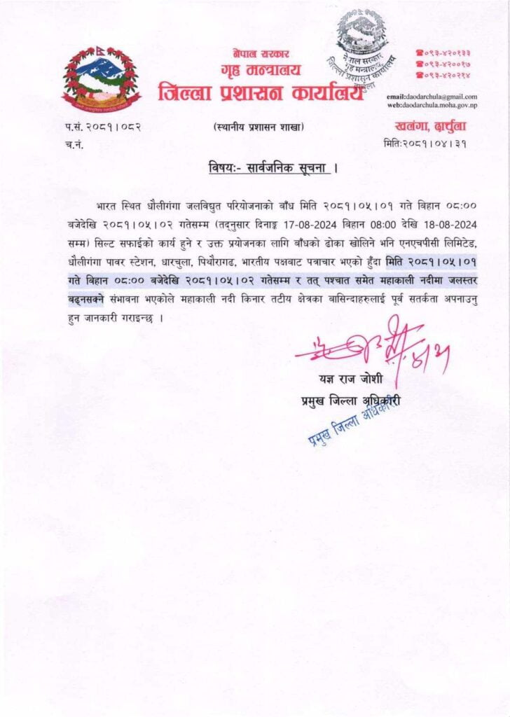 दार्चुलादेखि बैतडी, डडेल्धुरा, कञ्चनपुर भएर भारततिर बग्ने महाकालीमा पानीको बहाव र सतह बढ्न सक्ने भएका कारण नदी छेउछाउमा नजान र सतर्कता अपनाउन स्थानीय प्रशासनले अनुरोध गरेको हो । धौलिगङ्गा जलविद्युत परियोजनाको बाँध वर्षातको बेला हरेक वर्ष खोलिने गरिन्छ । परियोजनाको बाँध खोल्नुपूर्व सतर्कताका लागि जानकारी गराउने गरिएको छ ।