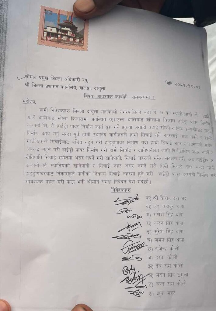 महाकाली नगरपालिका वडा नम्बर ७ का स्थानीयले थालीगाड खोलामा खानेपानी र सिचाई कुलो अवरुद्ध हुने गरी हाइड्रोपावरले काम गर्न सुरु गरेको भन्दै काम रोक्न माग गरेका छन् । स्थानीयको खानेपानी र नहर भत्किने गरी विकाल हाइड्रोपावर निर्माण कम्पनीले पावर हाउँस निर्माणको काम थालनी गरेपछि स्थानीयले काम रोक्न माग गरेका हुन् ।
