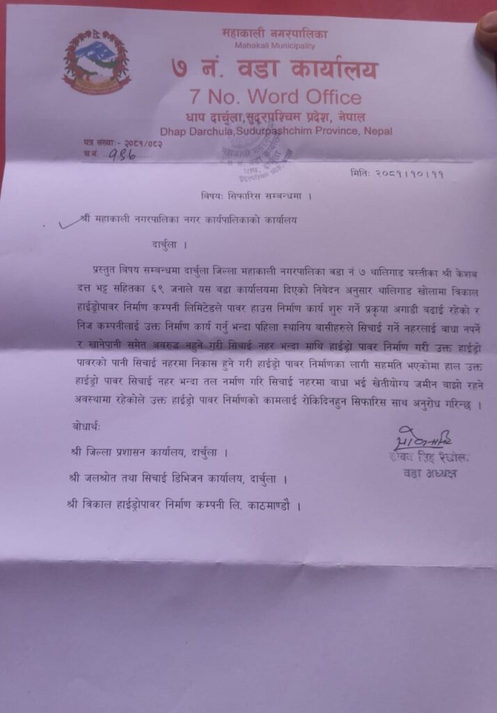 जनताको खानेपानी पाउने अधिकार र नहर सिचाई नै बन्द गर्ने गरी पावर हाउँसले काम गर्न थालेपछि स्थानीय वडा कार्यालय, जिल्ला प्रशासन कार्यालय, जलस्रोत तथा सिचाई डिभिजन कार्यालयलाई माग पत्र बुझाएका छन् ।