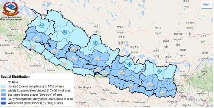 महाशाखाका अनुसार कोशी, बागमती र गण्डकी प्रदेशसहित पहाडी भेगका केही ठाउँमा मेघगर्जन र चट्याङसहित हल्कादेखि मध्यम वर्षाको सम्भावना छ । केही ठाउँमा ठूलो पानी पर्ने सम्भावना रहेको महाशाखाले जनाएको छ ।