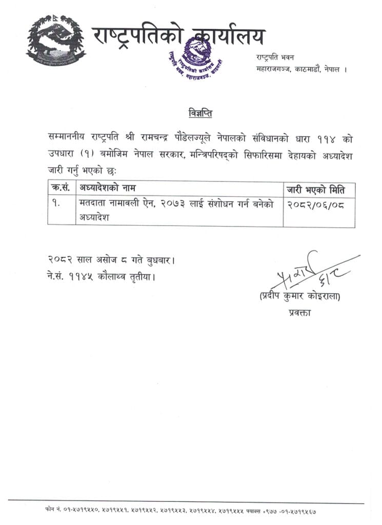 राष्ट्रपति पौडेलले संविधानको धारा ११४को उपधारा १ बमोजिम मन्त्रिपरिषद्को सिफारिसमा मतदाता नामावली ऐन, २०७३ लाई संशोधन गर्न बनेको अध्यादेश जारी गरेका हुन् ।