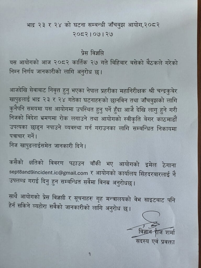 २३ र २४ भदौको घटनाका बारेमा छानबिन गर्न बनेको उच्चस्तरीय जाँचबुझ आयोगले आज एक विज्ञप्ति निकाल्दै यसबारे जानकारी गराएको हो ।