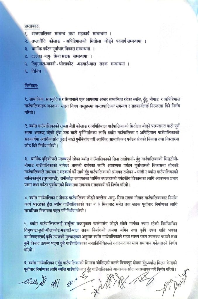 बैठकमा तीनै पालिकाबीच आपसी सहकार्य, सीमा क्षेत्रमा पर्ने सडक निर्माण, पदमार्ग विकास तथा पर्यटन प्रवर्द्धनका विषयमा संयुक्त रूपमा अघि बढ्ने सहमति गरेकाे छ।