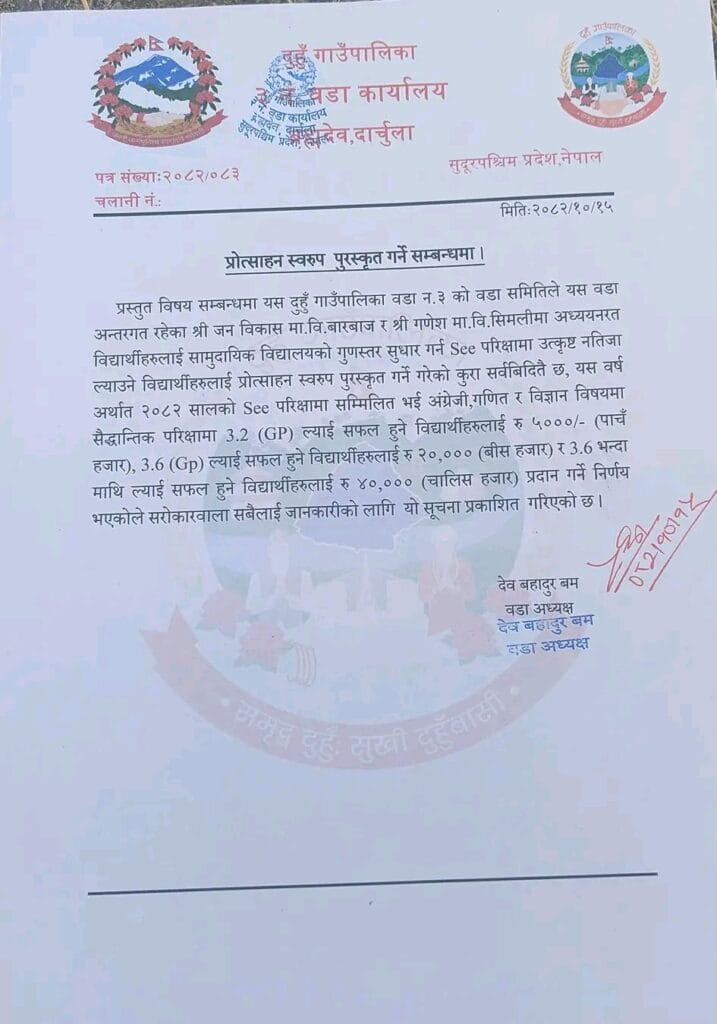 दार्चुला । माध्यमिक शिक्षा परीक्षा (एसइई) मा उत्कृष्ट नतिजा ल्याउने विद्यार्थीलाई दुहुँ गाउँपालिका वडा नम्बर ३ ले नगद पुरस्कारसहित सम्मान गर्ने घोषणा गरेको छ। वडाले एक सूचना जारी गर्दै पुरस्कार घोषणा गरेको हाे ।