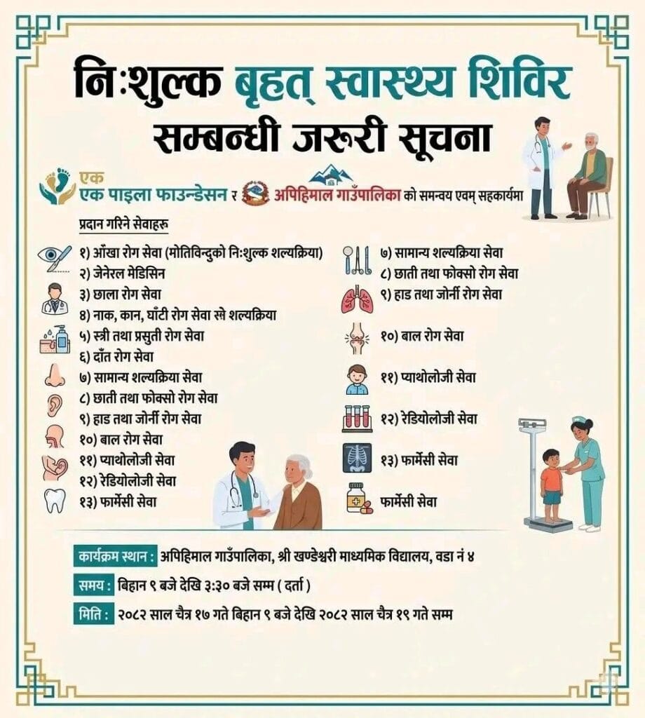 दार्चुला । अपिहिमाल गाउँपालिकामा बृहत् निःशुल्क स्वास्थ्य शिविर सञ्चालनको तयारी भएको छ । एकएक पाइला फाउण्डेसन र अपिहिमाल गाउँपालिकाको सहकार्य तथा समन्वयमा उक्त शिविर सञ्चालन हुने भएको हो ।